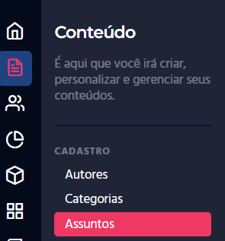 📌 No gerenciador da plataforma, acesse: Conteúdo → Assuntos e clique em Adicionar.