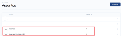 No painel de listagem dos Assuntos, você verá a estrutura organizada da seguinte forma: