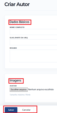 Uma nova aba será aberta com a opção Criar Autor. Nela, você encontrará os seguintes campos: