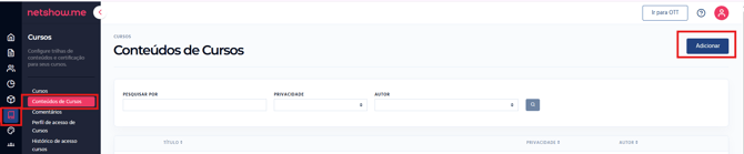 Menu Lateral > Cursos > Conteúdo de Cursos > Clique em + Adicionar (no topo da tela).