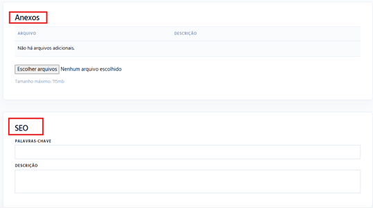 SEO: Preencha as palavras-chave e a descrição para que seu conteúdo seja encontrado mais facilmente em buscadores como o Google.