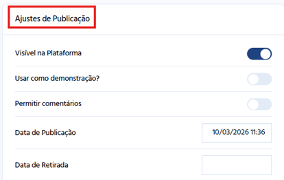 - Data de publicação e retirada: define a data e horário de publicação e retirada.