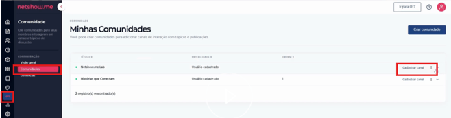 Cadastrar Canal: Localize a comunidade desejada e clique nos 3 ponitnhos em Cadastrar canal.