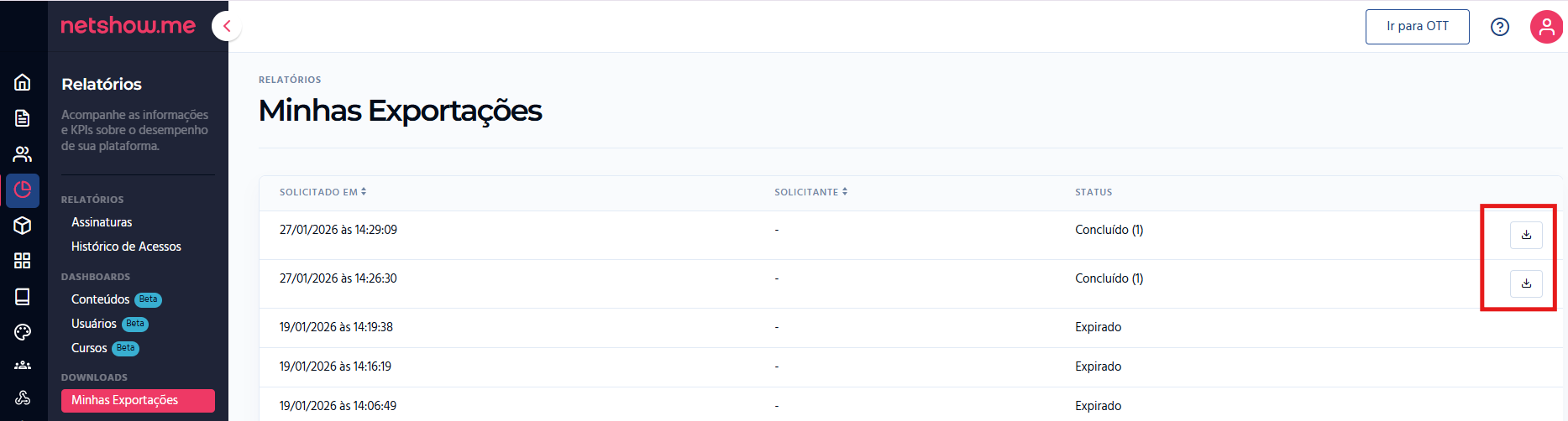 Para acessar o Painel de Exportações, faça login no gerenciador da plataforma OTT e, no menu lateral esquerdo, selecione Relatórios e, em seguida, Minhas exportações.