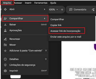 Com o PDF aberto na nova guia, clique em Arquivo > Compartilhar > Acessar link de Incorporação