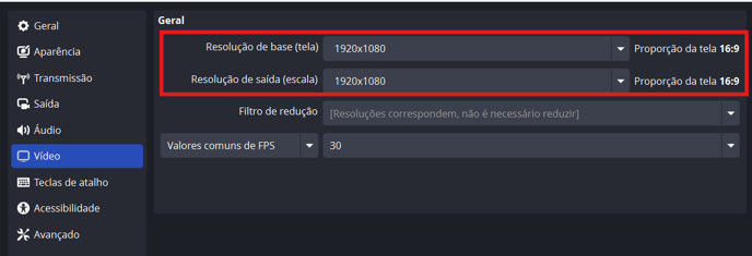 Ajuste a Resolução Base e a Resolução de Saída para que a proporção fique em 16:9