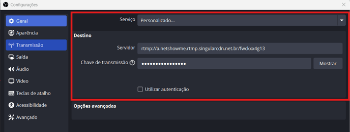 5. Com essas informações em mãos, volte ao OBS Studio > Configurações > Transmissão e faça as seguintes alterações: