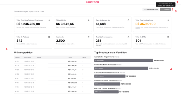 Após a finalização da live, esta tela exibe um resumo completo dos resultados obtidos, incluindo indicadores de desempenho, últimos pedidos realizados e produtos mais vendidos.
