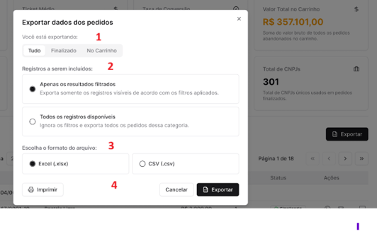 Todos os registros disponíveis: ignora os filtros e exporta todos os pedidos daquela categoria selecionada.