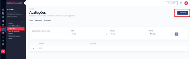As avaliações são configuradas de forma independente e depois vinculadas aos seus cursos. Para começar, acesse: Menu Lateral > Curso > Avaliações > Clique em + Adicionar.