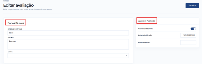 Visível na Plataforma: Ative (azul) para liberar o acesso ou desative (cinza) para manter em rascunho.