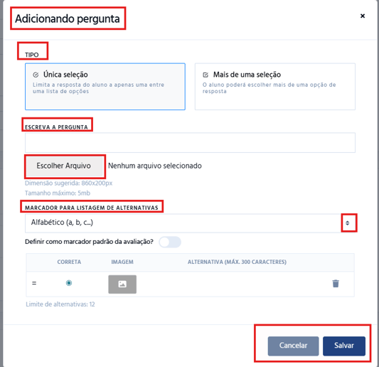 Tipo: Escolha entre Única seleção (apenas uma correta) ou Mais de uma seleção (múltiplas corretas).
