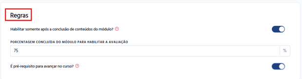 Liberação por progresso: Ative se a avaliação só puder ser feita após o usuário concluir uma porcentagem específica do módulo (ex.: 75%).