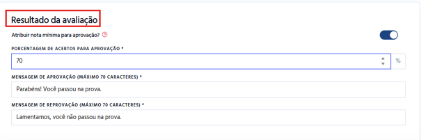 Mensagem de Reprovação: Instrução ou feedback exibido ao não atingir a nota (até 70 caracteres).