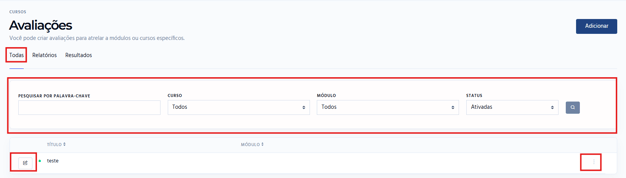 Na tela principal de Avaliações > Todas, você pode localizar e organizar seus testes rapidamente: