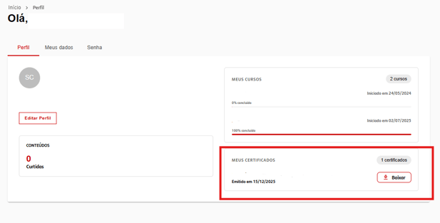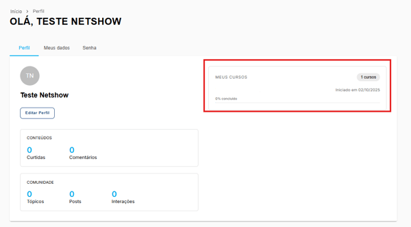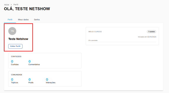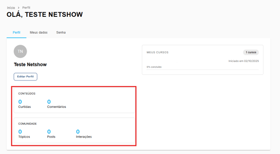 A página de perfil permite que pessoas usuárias visualizem e gerenciem informações relacionadas à sua conta, atividades e conquistas dentro da plataforma. Nessa área, é possível acompanhar dados pessoais, interações realizadas, progresso em cursos e certificados emitidos, tudo de forma centralizada.