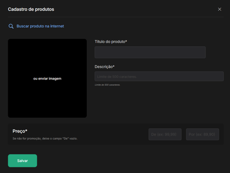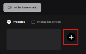 Clique no ícone “+” para cadastrar novos produtos que serão exibidos e disponibilizados durante a live.