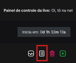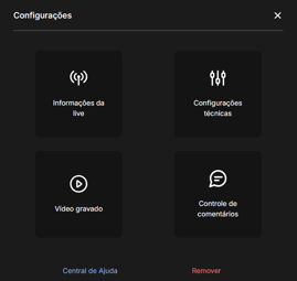 Permite acessar as informações da live, configurar aspectos técnicos.