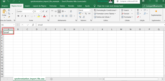Para realizar a sincronização, basta inserir o e-mail do usuário na coluna email e realizar o upload da planilha na plataforma.