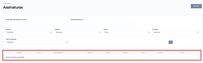 Quando não há registros compatíveis com os filtros aplicados, a mensagem “Nenhum registro encontrado” será exibida.